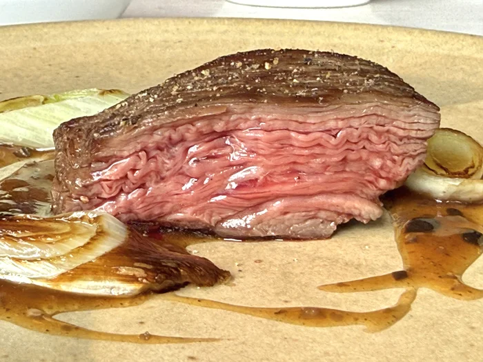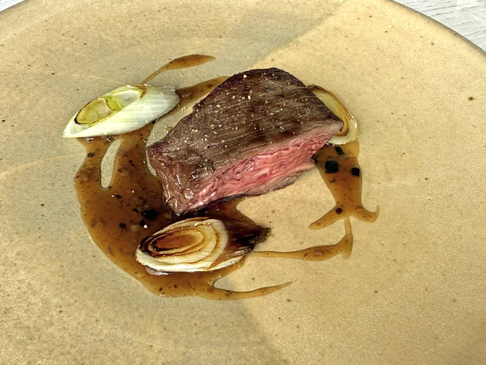 横から見るとお肉の層がはっきりとわかり、その迫力に圧倒されます。ごぼうと黒ニンニクのグレービーソースが、柔らかい赤身肉の旨味を力強く引き立てていました。