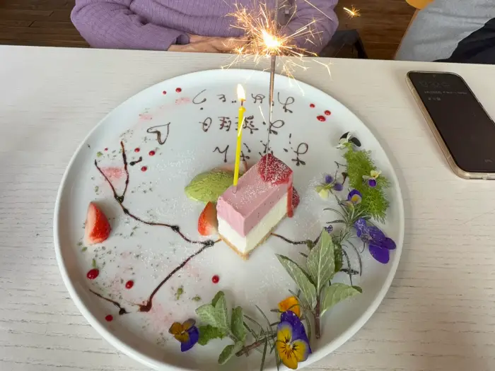 予約の時点で父の誕生日祝いであることを伝えていたため、花火とともに「お誕生日おめでとうございます」のメッセージが描かれたバースデープレートとして登場しました。